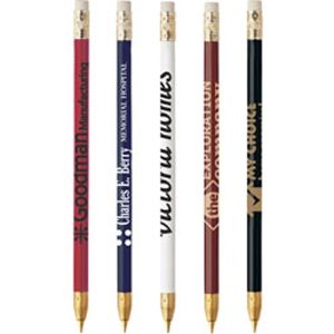 Stick pen with white eraser, wooden barrel, metal trim and your choice of ink color.