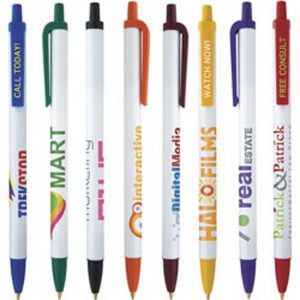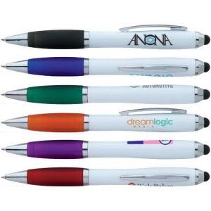 5 5/8 x 3/8 ABS plastic twist-action ballpoint with textured grip, pocket clip and device stylus.