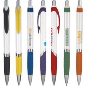 Ballpoint pen with plunger action mechanism, white barrel, chrome accents and blue or black ink.