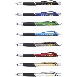 5 5/8 x 3/8 Jive plunger-action plastic ballpoint with device stylus, textured grip and pocket clip.