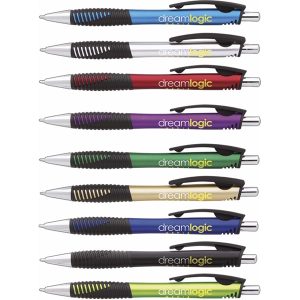 Plunger action ballpoint pen with colored barrel, grip section, black clip and black ink.