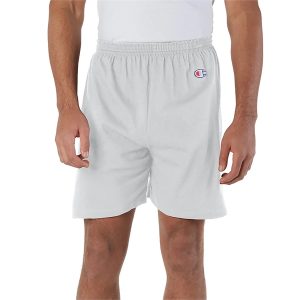 100% cotton jersey gym short with 6-inch inseam and multi-needle elastic waistband with inside drawcord.