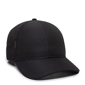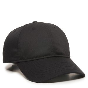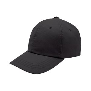 Structured six-panel polyester cap with low crown, pre-curved visor, hook and loop closure and moisture wicking fabric.