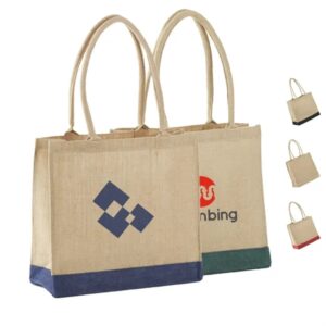 Eco-friendly jute bag with two-tone design, gusset, and custom imprint-perfect for stylish shopping and promotions.