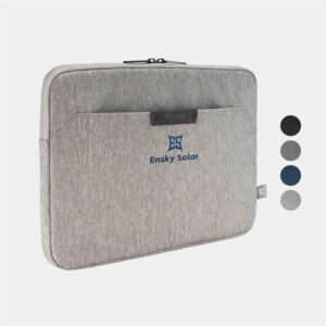 Sustainable RPET 600D slim laptop sleeve fits 15.” devices, 9″ front zip pocket, double-zip main compartment, durable metal puller