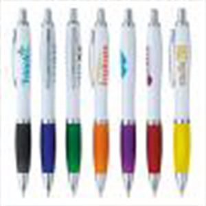 5 1/2″ x 1/2″ Ion White plunger-action plastic ballpoint pen with textured gripper and pocket clip.