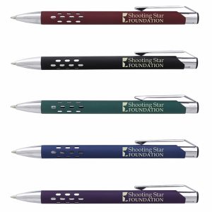 5 3/8″ x 3/8″ aluminum plunger-action pen with grip section and pocket clip.