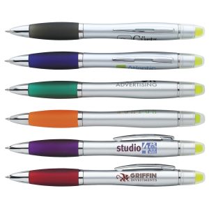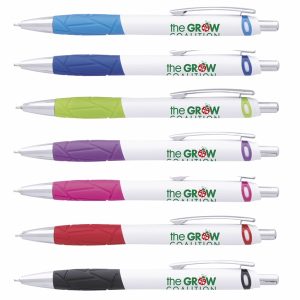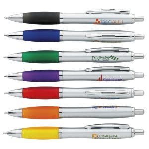 5 x 5.5 plunger-action plastic Ion Silver pen with colored grip, chrome accents, pocket clip and medium point.