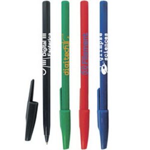 $0.765 3/4″ x 3/8″ plunger-action ABS plastic ballpoint pen with curved design, 1.2 mm point, black trim and pocket clip.