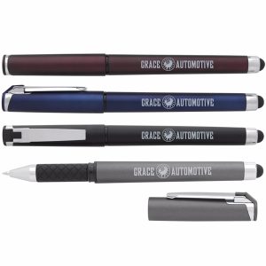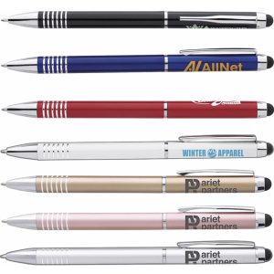 5 3/8 x 3/8 metal twist-action ballpoint pen with chrome accents, pocket clip and device stylus.