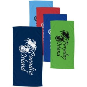 70″W x 35″H colored terry velour beach towel, made with USA sourced cotton.