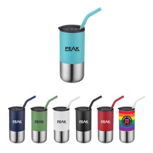 24 oz. travel mug with stainless steel bottom, grip handle and snug-fitting lid.