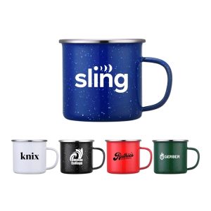 16 oz. enamel coated iron camping mug with stainless steel rim and speckled finish.