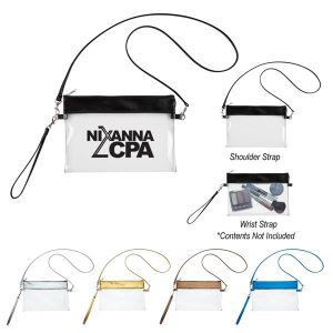 Clear PVC wristlet pouch measuring 8 1/2″ x 6″ with a black top zippered closure and a detachable wrist strap and shoulder strap.