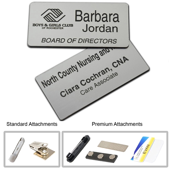 This 1.5″ x 3″ plastic engraved name badge will help you carve out a great new promotional strategy! Available in several colors, this useful giveaway comes with a customized full-color imprint of your brand logo. It can also be personalized to create an attention-grabbing nametag or nameplate. Standard attachments include pin and swivel clip, strap clip, military clutch and adhesive – magnetic and premium pin fasteners are also available. Choose what’s best for you!