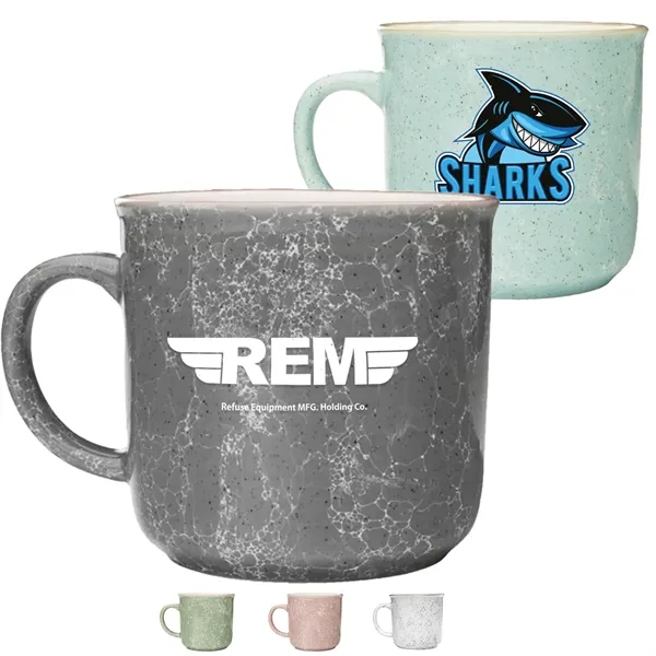 13 oz. ceramic camping mug with marble finish, C-handle and slightly flared top.
