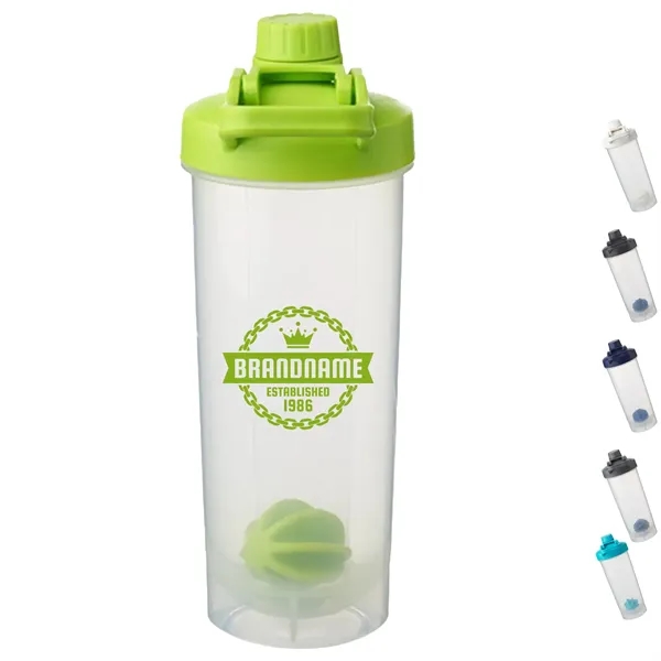 24 oz. plastic shaker bottle with mixing ball and handle.