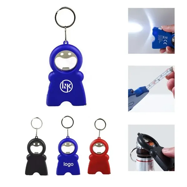 555491590This tool is made of ABS and alloy. Bottle opener with unique face design,the wide head seems to smile and doubles as a bottle opener, but that’s not all. Each foot has a handy feature! One has a tab that releases a 39 inches tape measure, and the other sports a tiny but powerful LED light. All are connected to a split ring.