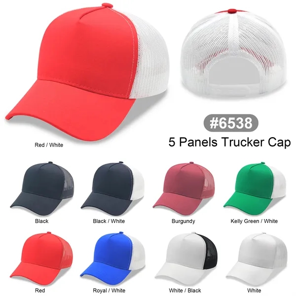 Take your next promotion on the road when you slip on these trucker-style ball caps. Made of durable cotton, this five-panel hat has an airy mesh back for comfortable wear, a curved reinforced visor, high profile and a rear snapback closure that fits most wearers. Choose from five two-tone designs and add your school, sports team, organizational or company logo or message to customize. Lowest price guaranteed. Free samples available upon request.