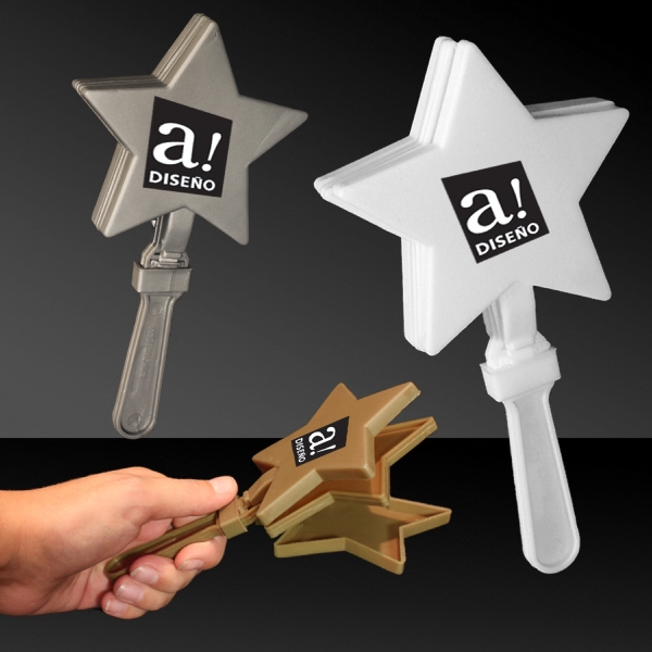 Hold your applause until you have one of our star shaped hand clappers! This 7″ high quality plastic noisemaker is sure to make your message or logo a star for any promotional project. Our star shaped hand clapper is great for sporting events, spirit nights and other recreational activities and also works well to acknowledge and strengthen company goals. Customize each one with a brand name or logo and cheer on your star players with this fun giveaway!