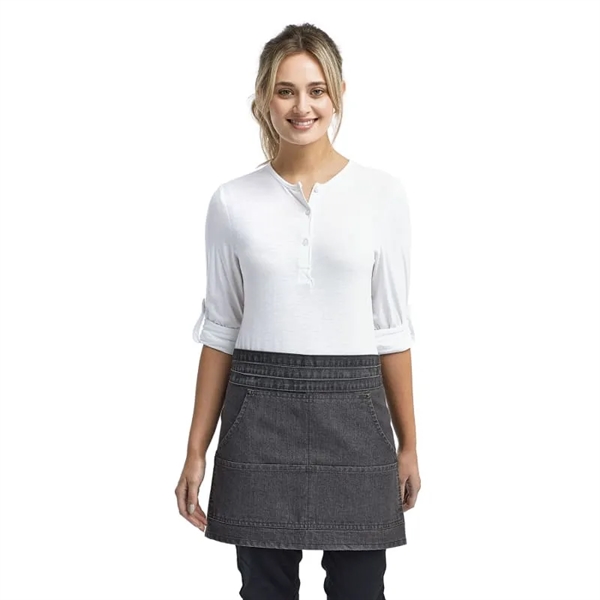 Unisex waist apron with rivets, four pocket compartments, and self-fabric ties.