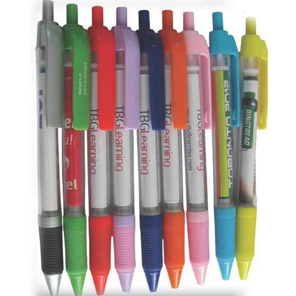 Roll out the red carpet on your promotional efforts with the power of the pen with these potent banner pens. Create a colorful branded advertisement with your logo, product or contact information with a banner that pulls right out of the barrel. This colorful 7.48″ x 2.67″ plastic ballpoint has a clear barrel with a plastic and rubber-grip tip, pocket clip and plunger action paired with your customized banner advertisement. The pen is the benchmark of promotional products, and these retractable banners turn it up to ten!