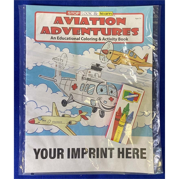 Coloring Book and Crayon Set: A Fun Pack! Make it Easy with the coloring book conveniently packaged with a 4-pack of crayons in a sealed poly bag. No assembly required. Talking all about Airplanes, Jets and Helicopters and the different jobs they can be associated with, kids will love the Aviation Adventures Coloring and Activity Book Fun Pack. Featuring 16 pages of coloring, games and fun all explaining the joy and excitement of a flight on a plane or helicopter. Recommended for ages 3 and up. Ideal for any aviation company, airline or travel agency.