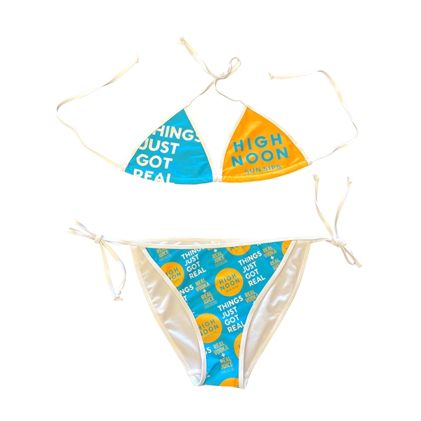 Polyester/spandex bikini with bra cups with all-over sublimated imprint in sizes extra small to 5XL.