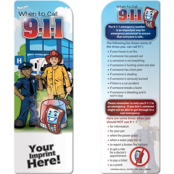 117319994Informative as well as useful, this When to Call 9-1-1 bookmark will be great as your next giveaway! This page holder provides the information to know when it’s a true emergency. Learn when it is right and wrong to call 9-1-1 and how to speak with the dispatcher. This double-sided book slip is durable, attractive and great for educating children. It’s perfect for mailing since it fits perfectly in a #10 envelope!