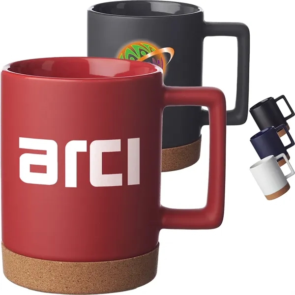 15 oz. Ceramic Mugs with matte exterior, glossy interior, square handle, and cork base. Stylish, practical.