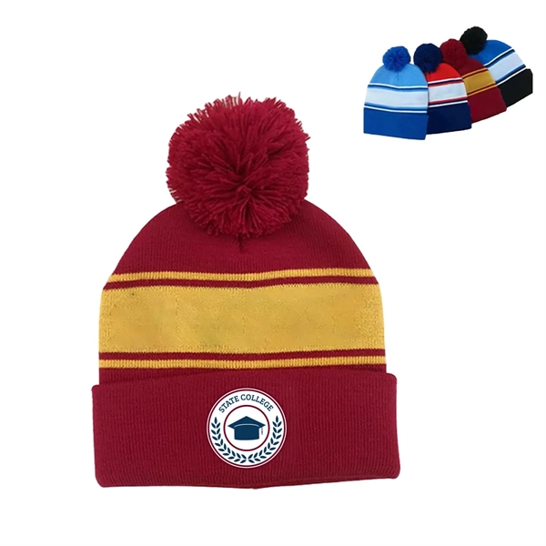555030754This beanie is made of acrylic material and features a fur ball on the top. The fur is rich and smooth. It has a mix color design, making it visually appealing. And it designed with the folding cuff. Perfect for various outdoor activities such as walking, running, hiking, ice-skating, skiing, and more.