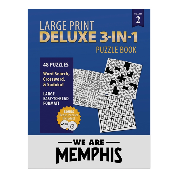 New. Deluxe Puzzle Book combines 3 styles of puzzles (Word Search, Crossword, Sudoku) into one book. LARGE PRINT format. Full color, heavy duty cover with dozens of puzzles plus bonus rebus puzzles. 48 pages, plus cover. For one color imprint choose from stock ink colors: Red 186C, Blue 286C, Green 355C, or Black. For blank, minimum quantity is 125 pcs.