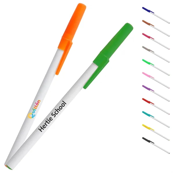 Bright and functional plastic pens featuring colorful caps, smooth blue ink, and available in 12 vibrant stock colors.