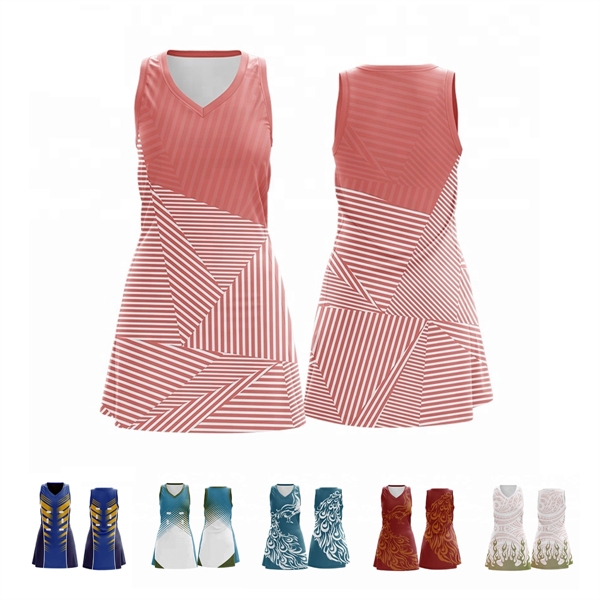 554111244Our netball dresses are generally the 140gsm birdseye polyester, neck can be customized to be crew or v. Digitally printed graphics all over the garment at no extra charge. Available in adult, youth sizes, male and female. Perfect for soccer, lacrosse, tennis, or many other sports teams.