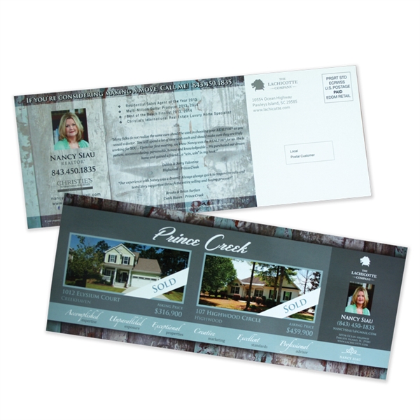 Digitally printed postcard measures 4.25″ x 11″ printed on 14PT C2S with no coating. Attract maximum attention at a minimum price! This postcard is perfect for direct mailings, in-store promotions, new business or office openings, special events, and customer appreciation. Utilize the USPS online tools to figure out which carrier routes you want to target and determine the number of postcards. Deliver completed postcards and postage payment to yo9u local post office. The prices shown are for postcards only. Submit art on template provided.