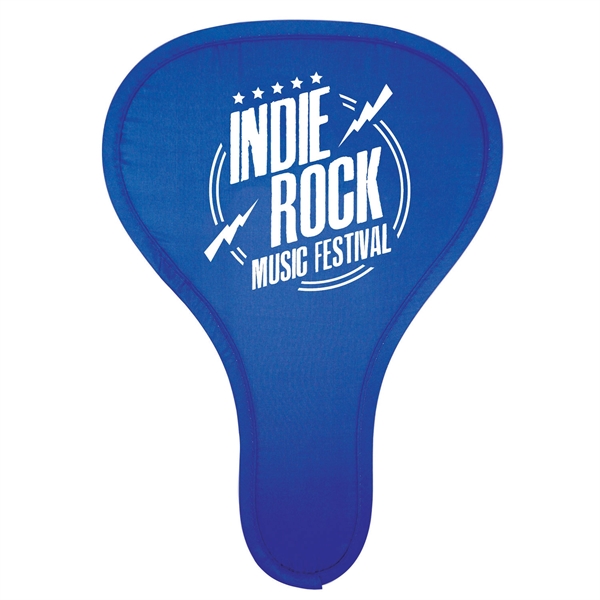 Folding hand fan with an elastic strap and silver on one side with a color on the opposite.