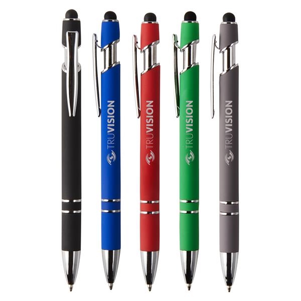 This pen is great promotional giveaway item for all sorts of businesses! Our Gardena Velvet-Touch VC Stylus Pen features a plunger action mechanism, stylus tip on top, chrome ferrule and clip, black medium point and high-quality Glide-Write ink. The comforting soft-touch feels great in the hand. Choose from an assortment of pen colors and make sure to add a brand name, logo or message using the available customization methods.