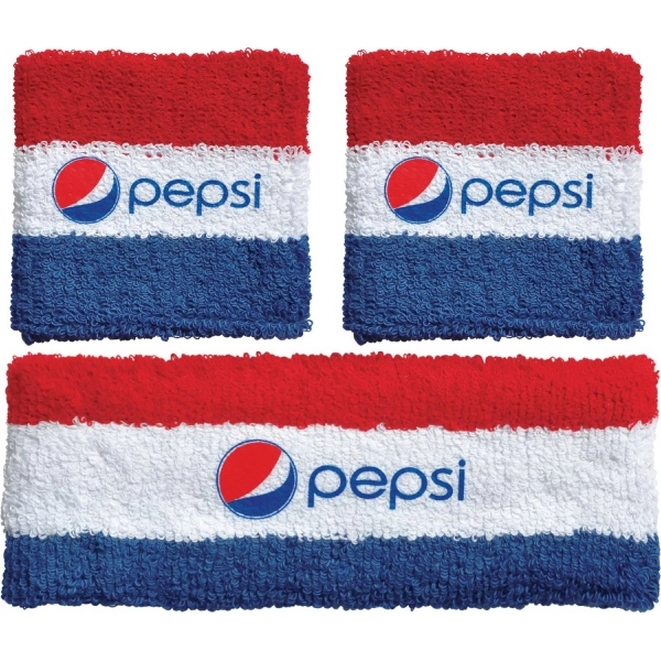 This set combines a headband with a pair of wristbands for a heavyweight set that will keep you dry. Pieces feature a retro striped design and are made of terry cotton, making them soft and absorbent. Personalize this set with your team mascot or company name. Centering your logo in the middle stripe is recommended. Stripe sizes may be adjusted to accommodate art for no additional charge. Pricing includes a 1 color heat transfer. Made in the USA.