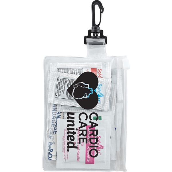 The On The Go 12-Piece First Aid Pack is a travel first-aid kit in a PVC pouch with a plastic zip closure and a plastic carabiner for convenient first aid travel care. The kit includes 4 adhesive bandages, 1 alcohol cleansing wipe, 1 antiseptic wipe and 1 insect sting relief wipe. Also includes SPF15 Lip Balm, First Aid Burn Cream, 1% Hydrocortisone Cream, Triple Antibiotic Ointment and Instant Hand Sanitizer in single-use packets. Meets FDA requirements and is available for shipment within the United States (including Alaska, Hawaii and Puerto Rico). Not available for export. See General Information page for additional air shipment charges. Not available in Canada.