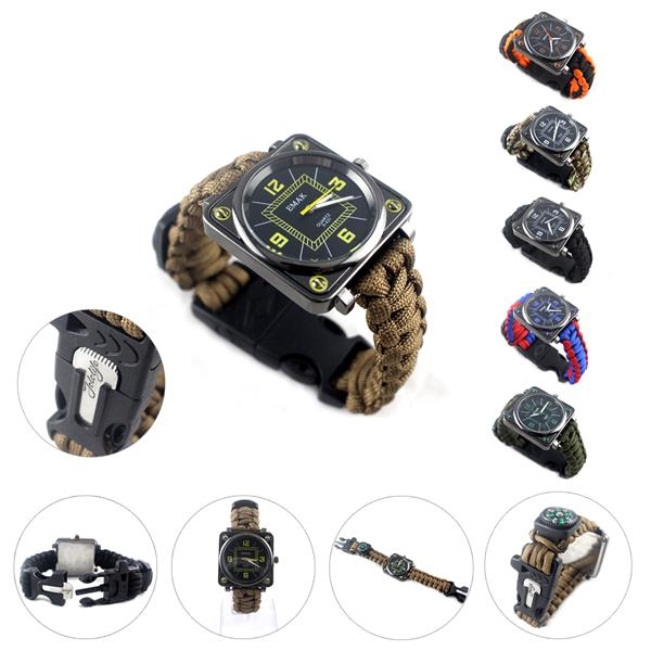 The survival gear includes bracelet watch, compass, whistle ,thermometer, fire starter, paracord.