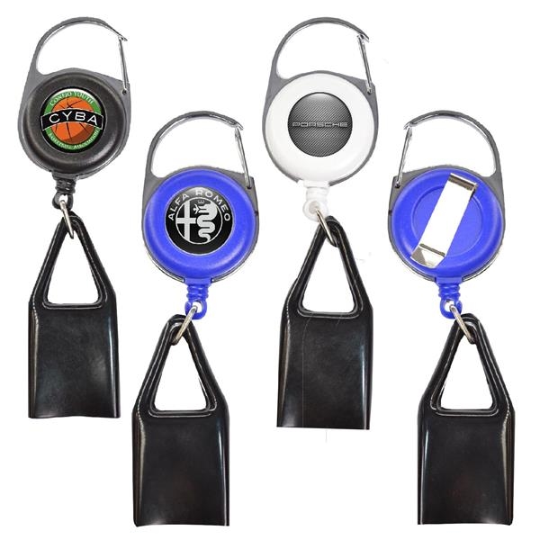 Pen Holder Round Carabiner Badge Reel Holder with Belt clip and a 24″ retractable nylon cord with metal belt clip backing and durable vinyl snapback strap. Optional full-color decal sticker w/ epoxy dome or digital UV print. Available in a variety of body colors to choose from.