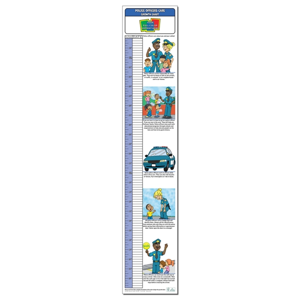 Police Officers Care Growth Chart. Fun, attractive illustrations in eleven different styles. Hang on the wall to measure children up to 5 feet tall! Fun for kids of all ages. NEW! Police Officers Care Growth Chart. The growth chart promotes a positive image while teaching children valuable lessons about crime prevention – such as where to find an officer when you need one and what to do if you are lost. The Police Officers Care growth chart reminds children that law enforcement officers really do care and are there to help as you grow up.