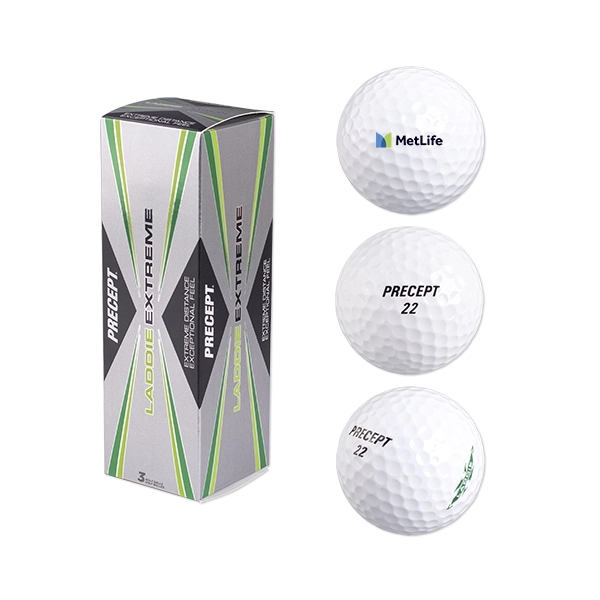 554681503Looking for a high performing golf ball that will not break the bank? Consider the Precept® Laddie Extreme Golf Balls. The 372 dimples on this ball help to increase the launch angle and decrease drag. Higher handicap and slower swinging players will struggle to find an affordable ball that does not feel like a rock when you hit it. Stock Design on balls and box: Each ball will have stock design in 3 locations of the ball, 2 stock designs read Precept and 1 stock design reads Laddie X. Logo placement and logo direction may vary from ball to ball. The retail box is stock art. Pricing includes: 3 Balls in Retail Box, Same Full Color Imprint on one location of each of the 3 balls. Must be purchased in multiples of 3.