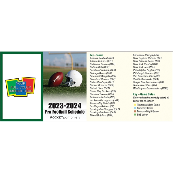 Pocket Pamphlet Informative Cards provide tips and information on any subject and fit right in your pocket! This 2023/2024 Pro Football Schedule pamphlet is a tri-fold pocket size informative card that has the full schedule of games for the upcoming season. Every team, every game listed from week 1 through the playoffs, so you won’t miss a moment of the best games. Folds to the size of a credit card. Imprinted with your message. Great for bars, pubs, restaurants, and sporting good stores. Folded size: 2″ x 3.25″.