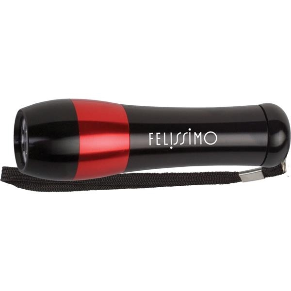 Light up your marketing campaign with small contoured metal flashlights! Measuring 4 1/2″W x 1 1/4″Dia, these devices are solid black with a blue, green, red or silver stripe with your company logo laser-engraved or screened on to a 1 1/2″W x 1/2″H, 1/2″W x 3/8″H, or 2″W x 3/8″H imprint area (either on the grip or the color stripe). These small devices feature 9 white LED lights, convenient wrist strap, and use 3 AAA batteries (not included).