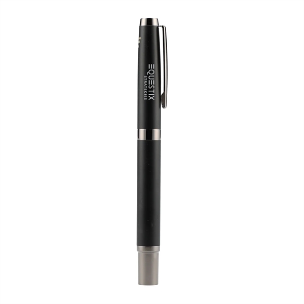 The recycled brass ultra gel roller ball pen features a recycled brass barrel and gunmetal chromed metal accents.