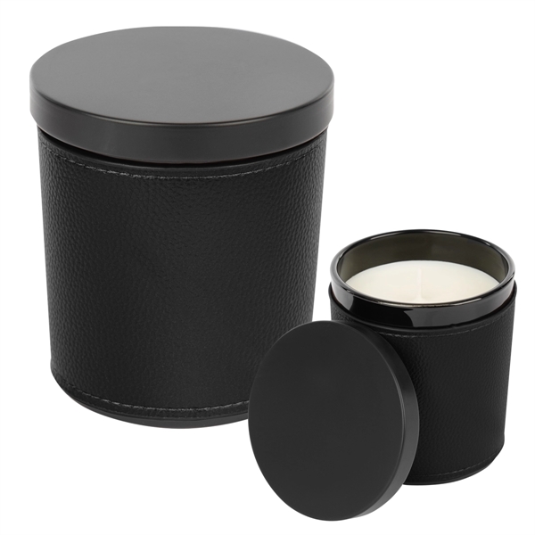 Scented candle with a leatherette sleeve, soda lime glass, soy wax and a single wick.