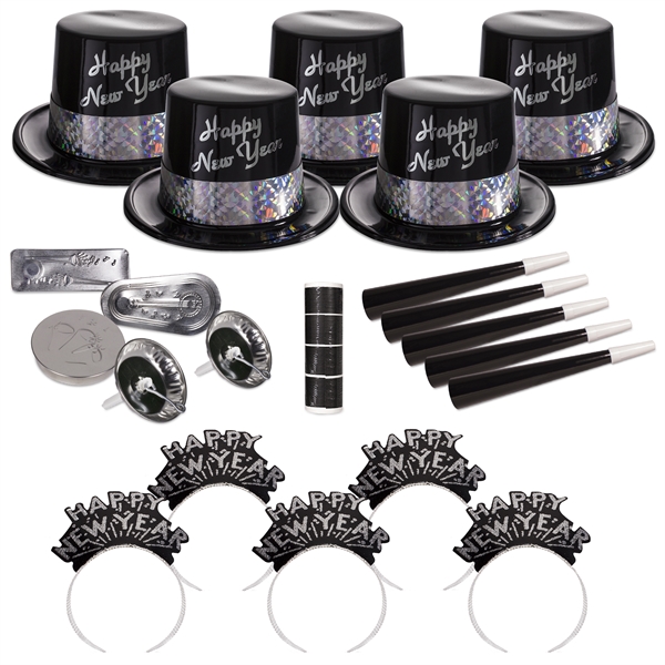 507203146Take any party to the next level with the silver and ebony fantasy New Year’s Eve party kit for 50 people! This eye-catching kit includes: 25 black plastic top hats with silver prismatic bands and “Happy New Year” accents, 25 black and silver “Happy New Year” glittered tiaras, 25 assorted metal noisemakers, 25 foil horns and 200 serpentine throws. This unimprinted party collection is the ideal way to create a large party with all of the fixings in a snap. Add some color, excitement and convenience to your next event with this kit today!