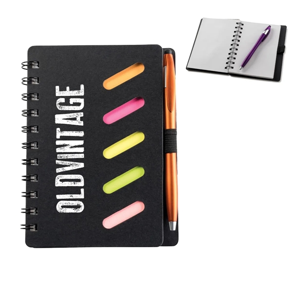555028951Made of black cardboard with spiral bound journal book with 60 white sheets,five different neon sticky flags,and a mini ballpoint pen with black ink. You can close this notebook with its tuck-in flap. Perfect for meetings, tradeshows,training seminars,or to office staff and school.