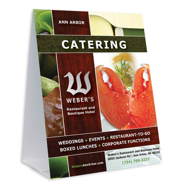 Digitally printed table tent measures 4 1/4″ x 5 1/2″ folded, prints on 14PT C2S with no coating. An effective advertising tool in the service industry. A colorful way to display a restaurant’s daily special, a lounge’s exotic drink or a hotel’s breakfast buffet. Don’t overlook it’s potential at reception desks, tradeshows or checkout counters. Use anywhere you attract customers. Ships flat, unfolded. Submit art on template provided.